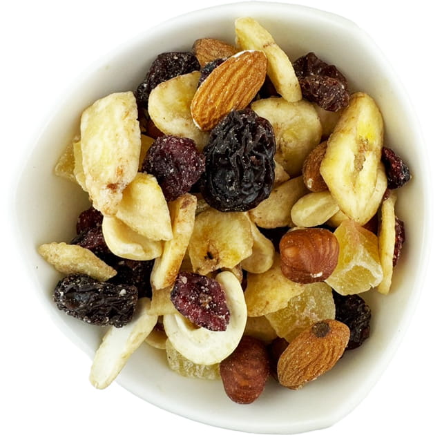- SKŁDNIKI: chipsy bananowe (cukier, olej kokosowy, aromat bananowy naturalny), orzechy nerkowca, arachidowe,laskowe, migdały, rodzynki (olej słonecznikowy), żurawina (cukier, olej słonecznikowy), ananas kandyzowany (cukier, regulator kwasowości - kwas cytrynowy, sub